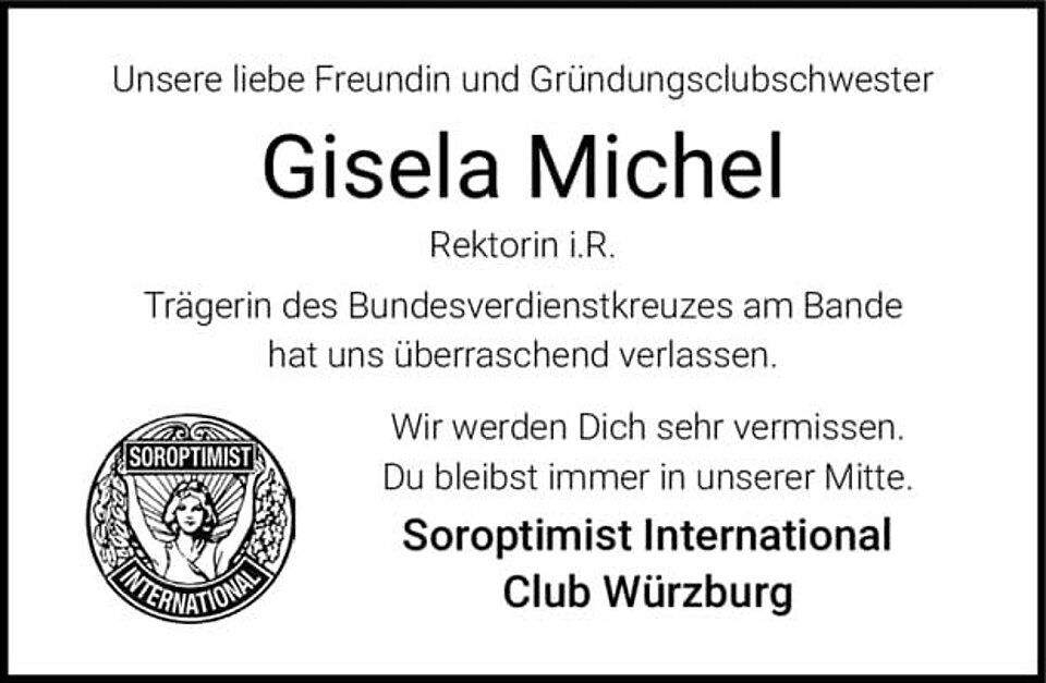 Gisela Michel wird uns stets in ehrender und liebevoller Erinnerung bleiben.